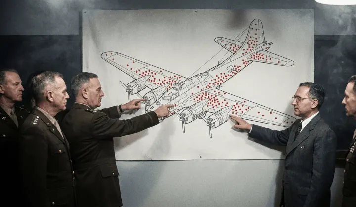 Generaller ve mühendisler, görevden sağ salim dönmeyi başaran uçakları hangara çekip incelemeye başlıyorlar. Ellerinde kağıt kalem, her bir mermi deliğini tek tek not ediyorlar. Ortaya çıkan veri tablosu çok net bir desen gösteriyor: Uçakların gövdesi, kanat uçları ve kuyruk kısmı mermi delikleriyle dolu. Ama ilginç bir şekilde motor ve kokpit kısmında neredeyse hiç hasar yok.